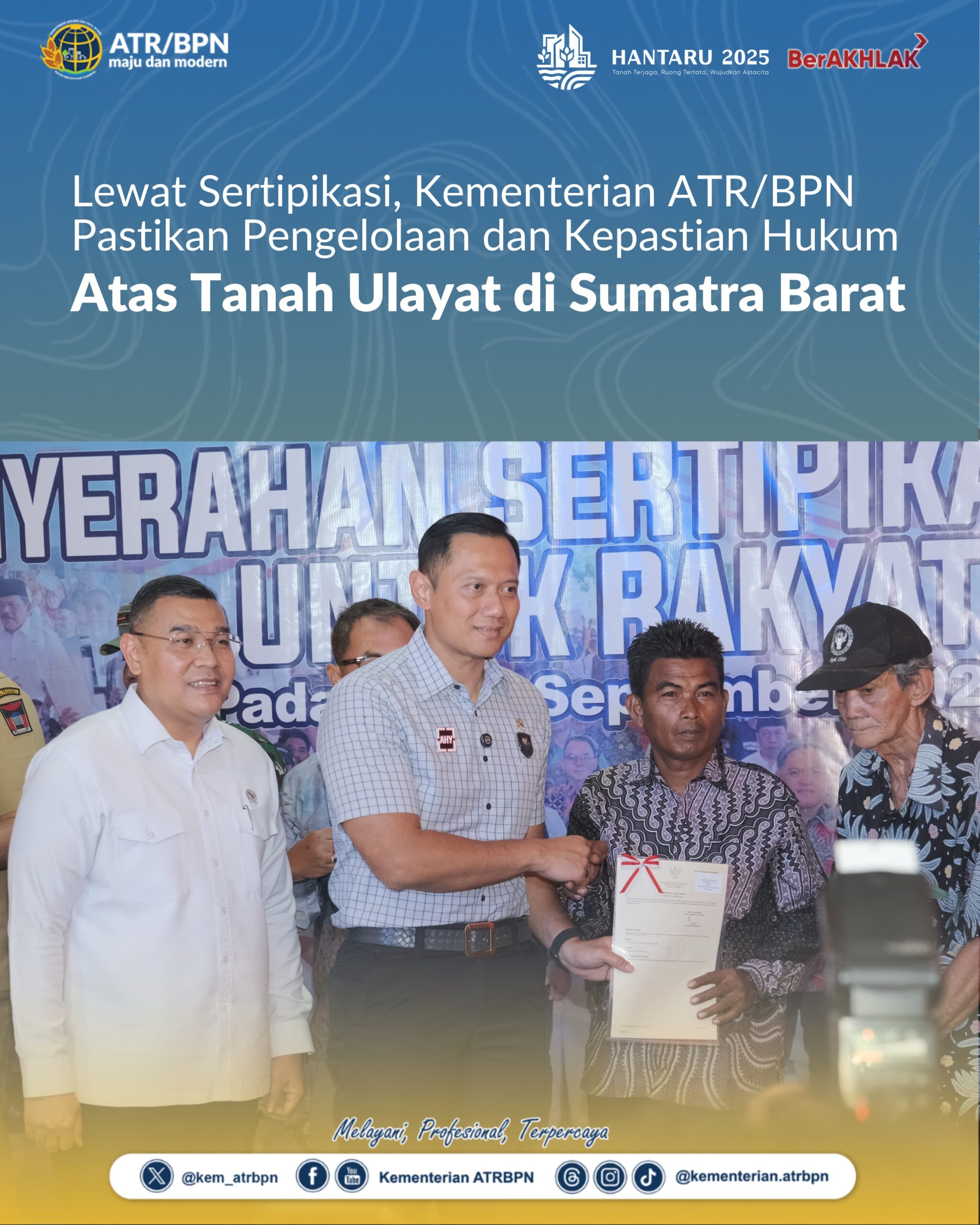 Hal ini disampaikan oleh Wakil Menteri (Wamen) ATR/Wakil Kepala (Waka) BPN, Ossy Dermawan, pada kegiatan Penyerahan Sertipikat Tanah untuk Rakyat, di Kerapatan Adat Nagari (KAN) Kuranji, Kota Padang, Selasa (30/09/2025).