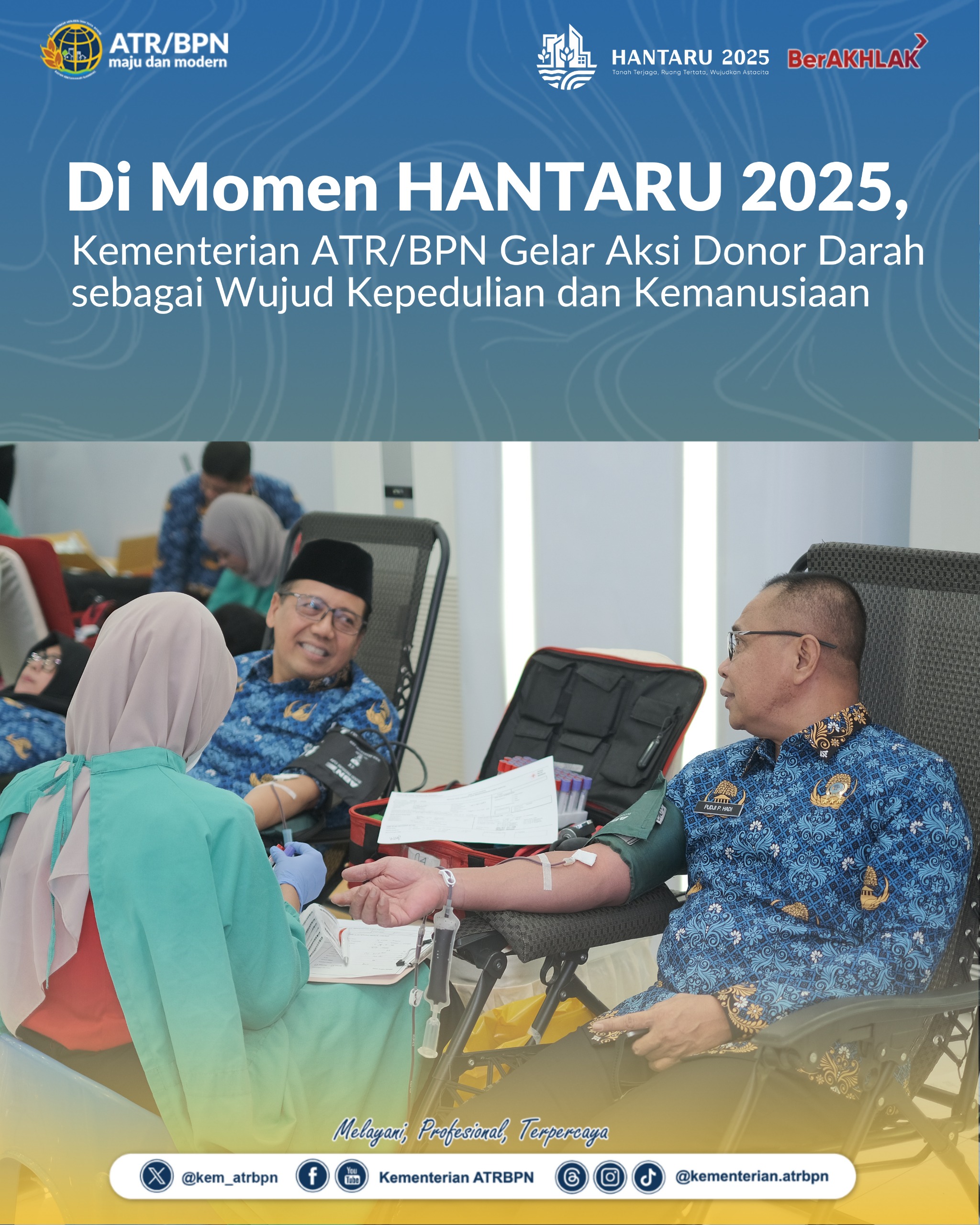 Sekretaris Jenderal (Sekjen) Kementerian ATR/BPN, Pudji Prasetijanto Hadi, menyebut donor darah ini cerminan dari semangat HANTARU yang tidak hanya berorientasi pada tata ruang dan agraria, tetapi juga menjunjung tinggi nilai-nilai kemanusiaan.