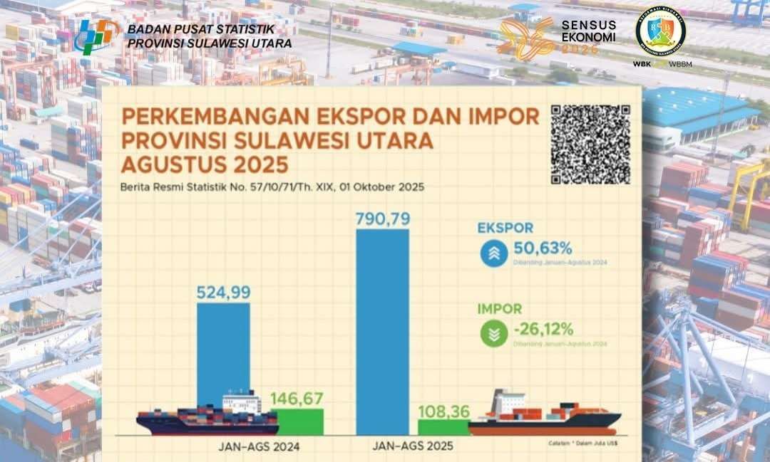 Dengan capaian ini, neraca perdagangan Sulawesi Utara tetap mencatatkan surplus signifikan, menunjukkan daya saing produk ekspor yang terus menguat di pasar internasional.
