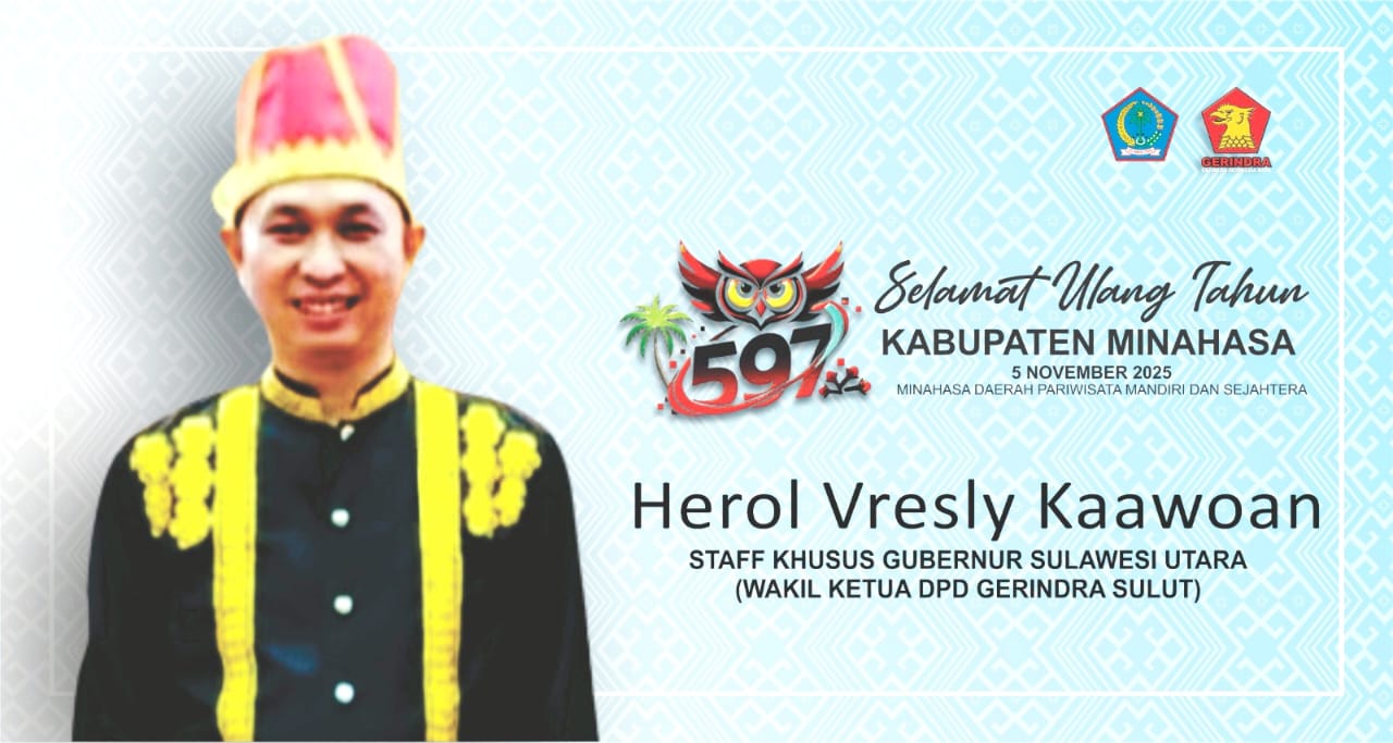 SATUUNTUKSEMUA.ID – Dalam rangka memperingati Hari Ulang Tahun (HUT) Kabupaten Minahasa ke-597, Herol Vresly Kaawoan (HVK) menyampaikan ucapan selamat dan harapan terbaiknya.