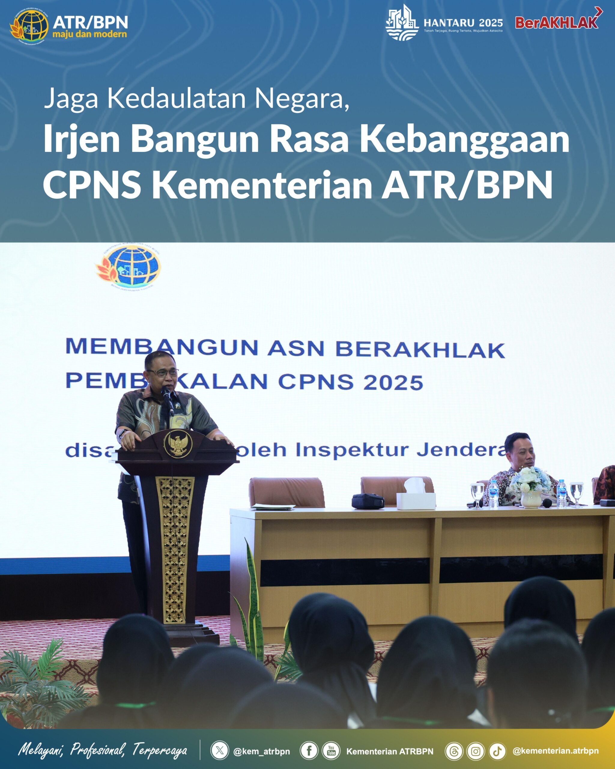 “Ada yang ditempatkan di perbatasan, ada yang di pulau terluar. Jadi jangan berangan-angan penempatan hanya di Pulau Jawa,” tutur Irjen Kementerian ATR/BPN di hadapan 331 peserta Latsar CPNS Angkatan I s.d. VIII Gelombang 1 Tahun 2025.