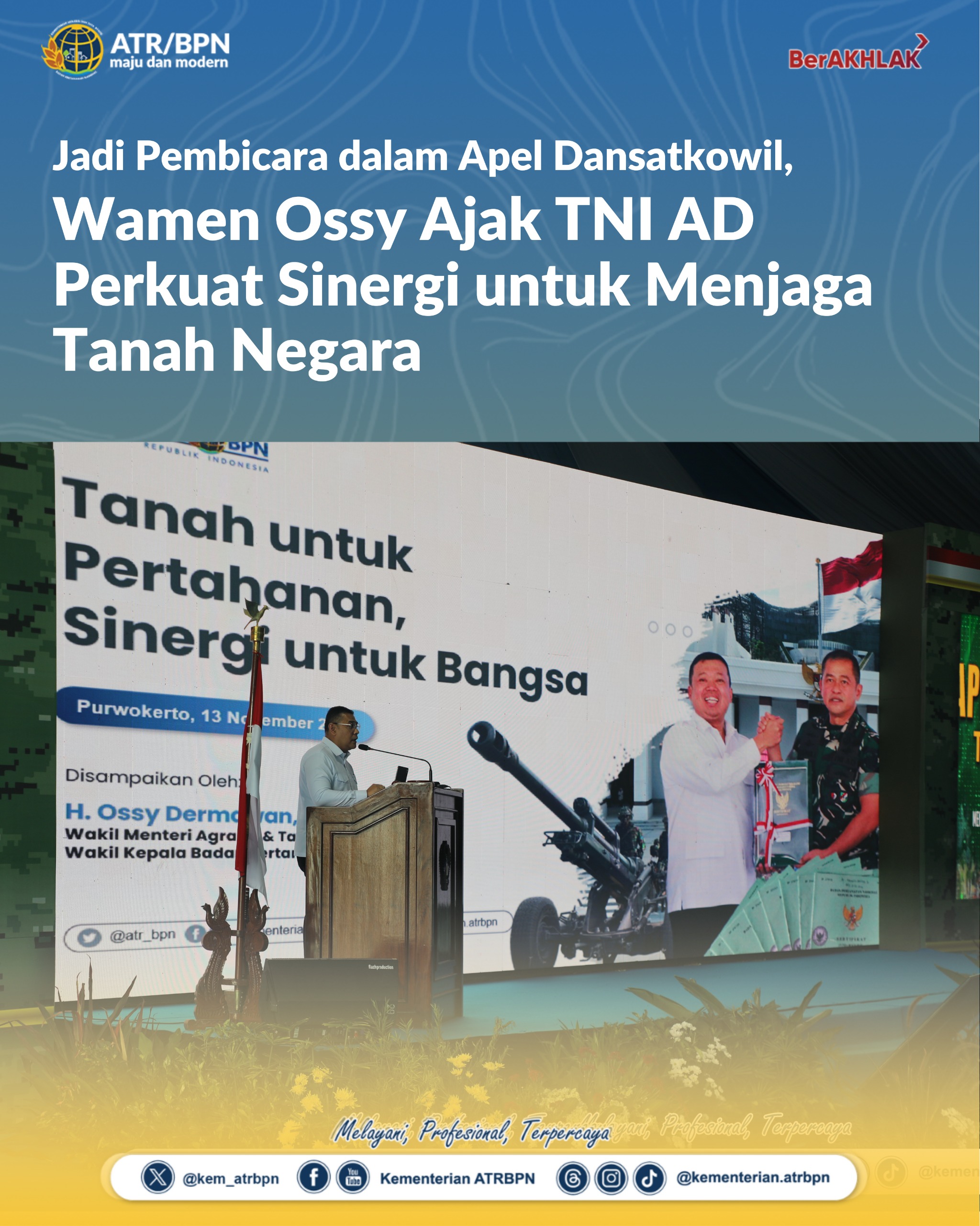 “Kami berharap kerja sama antara Kementerian ATR/BPN dengan TNI, khususnya TNI AD, tidak hanya dalam menertibkan aset, tetapi juga memastikan bahwa seluruh tanah dan ruang di daratan Indonesia benar-benar dikuasai dan dilindungi oleh negara,” ujar Wamen Ossy dalam sambutannya pada acara yang berlangsung di Kabupaten Banyumas.