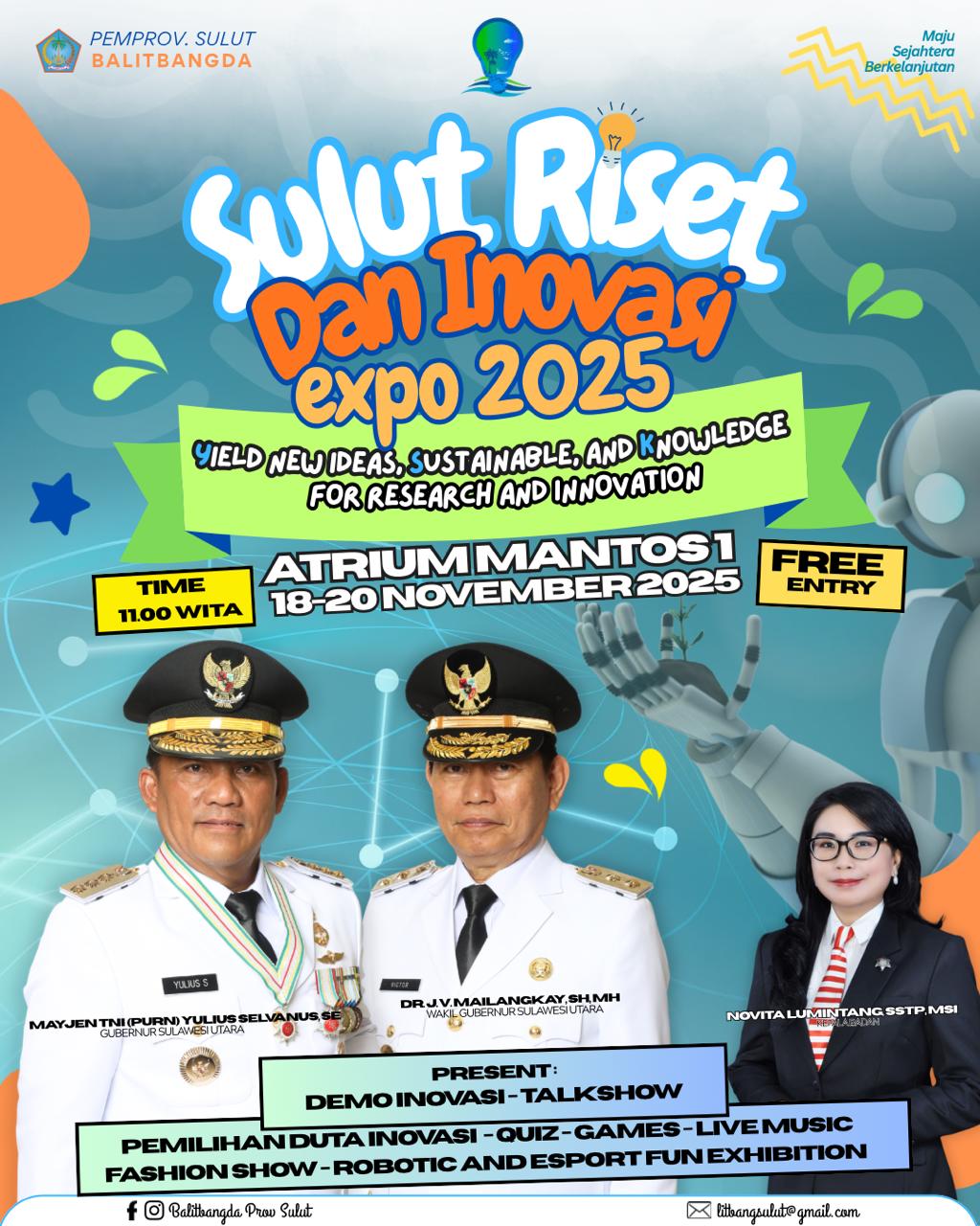 SATUUNTUKSEMUA.ID – Pemerintah Provinsi Sulawesi Utara (Pemprov Sulut) akan mengelar Event Sulut Riset dan Inovasi expo 2025 rencananya berlangsung pada tanggal 18 hingga 20 November 2025 di Atrium Manado Town Square (Mantos) 1.