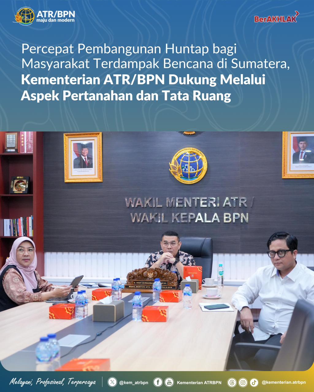 “Melalui aspek pertanahan dan tata ruang, kami membantu pemerintah daerah di Sumatera agar pembangunan Huntap dapat dipercepat. Kami memastikan lokasi yang ditetapkan memiliki kepastian hukum (sertipikat) dan tidak bermasalah,” ujar Wakil Menteri (Wamen) ATR/Wakil Kepala (Waka) BPN, Ossy Dermawan, dalam rapat yang berlangsung secara daring, Minggu (28/12/2025) malam.