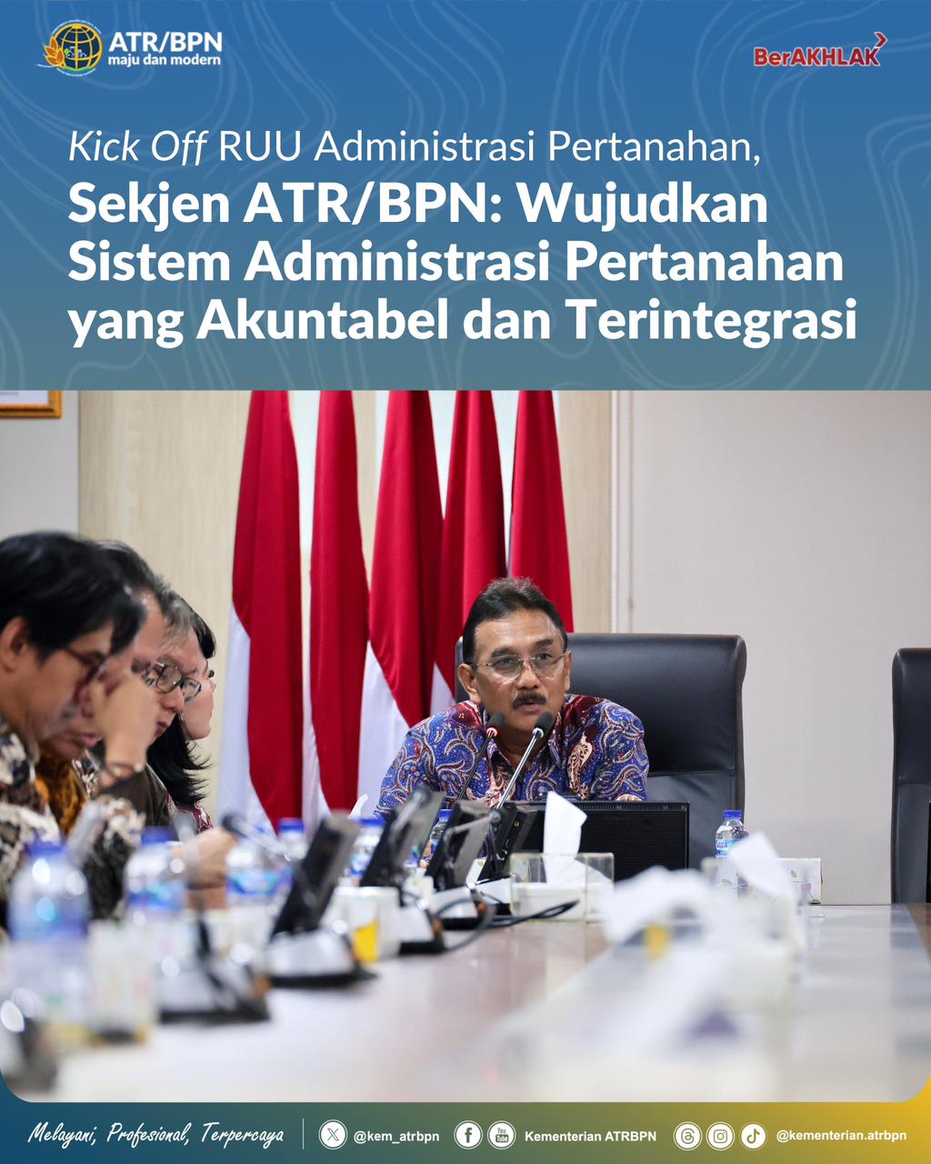 Tim penyusun RUU Administrasi Pertanahan diketuai oleh Staf Ahli Bidang Teknologi Informasi, Dwi Budi Martono. _Kick Off Meeting_ tersebut dihadiri oleh Pejabat Tinggi Madya dan Pratama di lingkungan Kementerian ATR/BPN serta para pemangku kepentingan terkait, baik secara luring maupun daring.