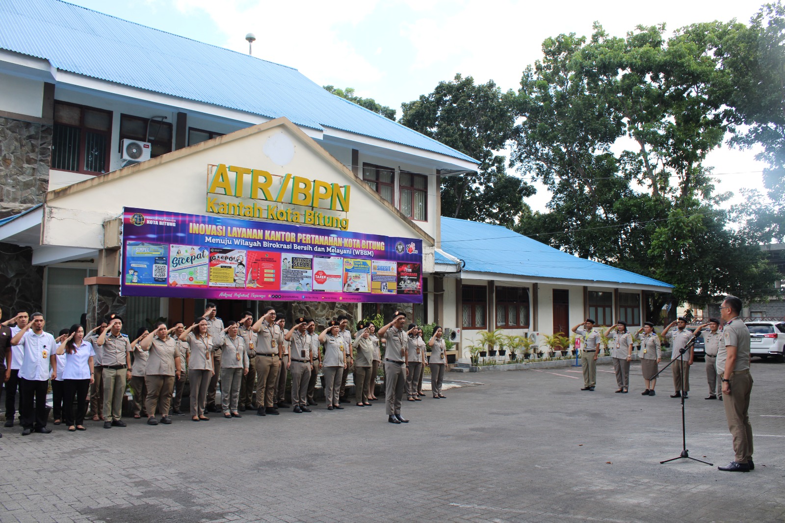 Seluruh jajaran pegawai tampak berkumpul di halaman kantor untuk apel pagi. Kegiatan ini merupakan agenda wajib bagi Aparatur Sipil Negara (ASN) di kantor pertanahan kota Bitung.