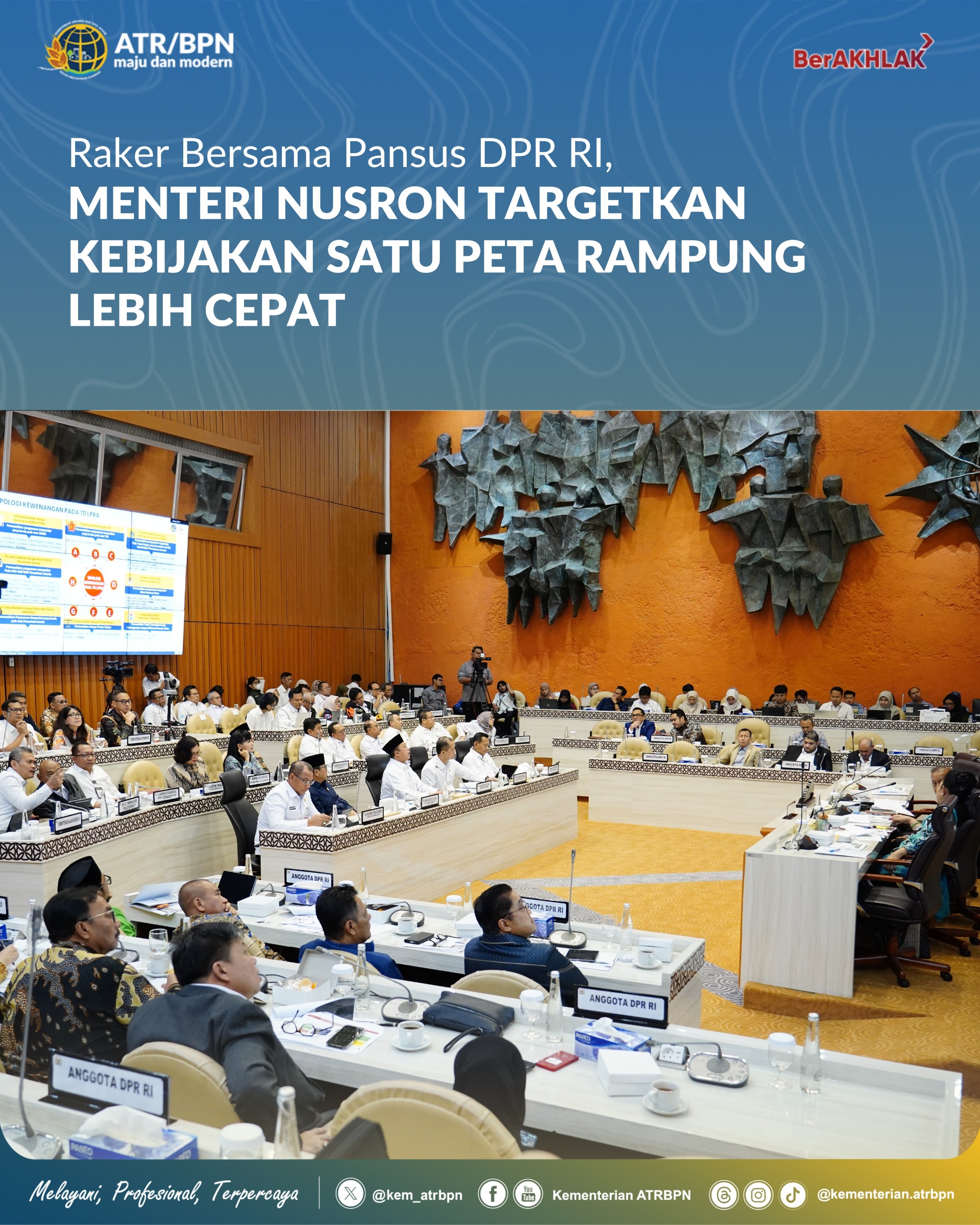“Kalau bisa sebelum tahun 2028, peta sudah jadi. Ada waktu 2 tahun, kita menyelesaikan masalahnya. Sehingga tahun 2029, sudah tidak ada lagi konflik agaria. Itu *legacy* kita,” tegas Menteri Nusron di hadapan Wakil Ketua DPR RI, Saan Mustopa, serta seluruh peserta rapat kerja.