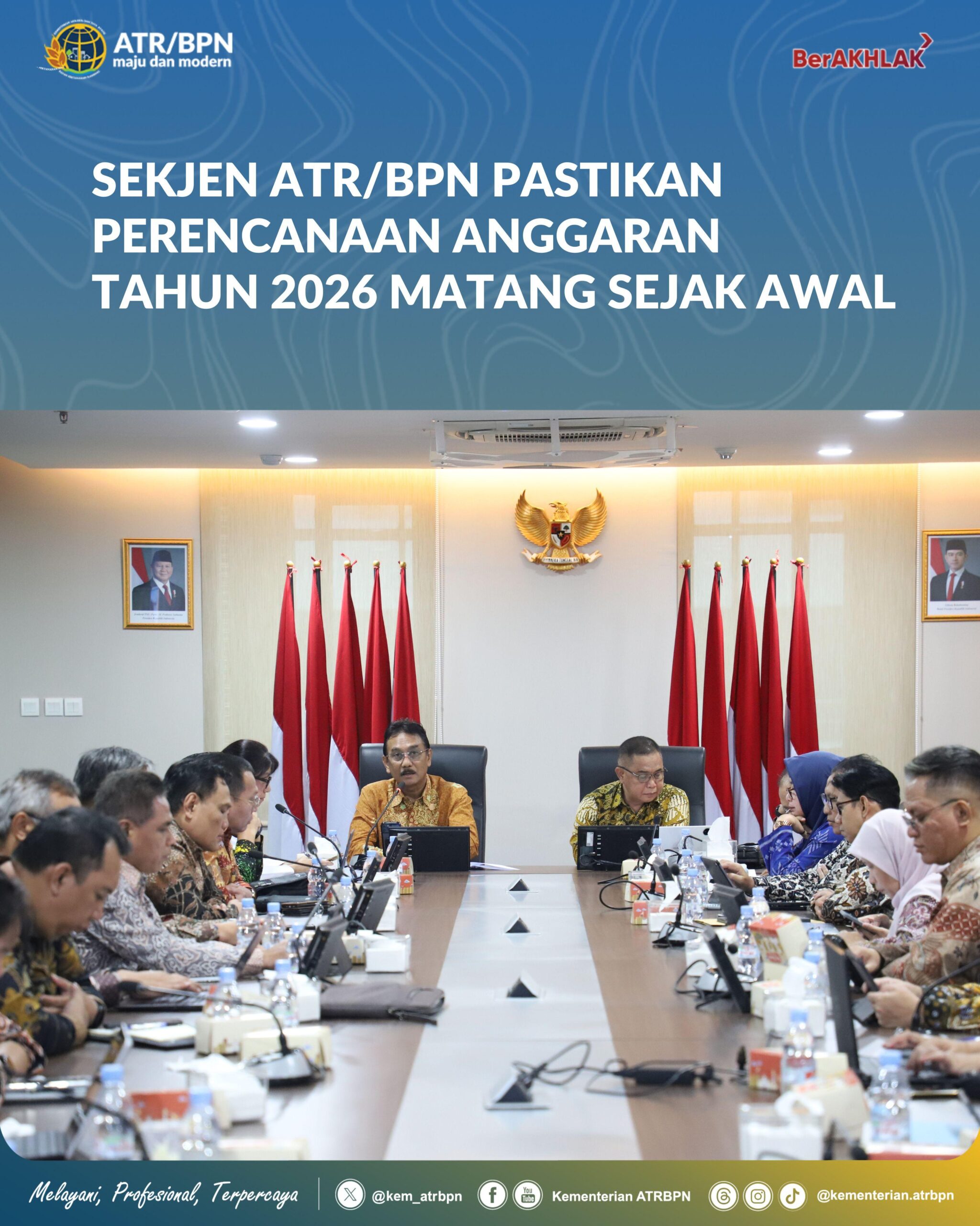 Guna menjaga agar realisasi anggaran di tahun ini tetap stabil, Sekretaris Jenderal (Sekjen) ATR/BPN, Dalu Agung Darmawan, mengimbau jajaran, baik di pusat maupun daerah untuk menyiapkan perencanaan matang, yang dimulai dengan Rapat Evaluasi Kinerja dan Program Tahun 2025 serta Evaluasi Rencana Aksi Triwulan I Tahun 2026, Rabu (04/02/2026).