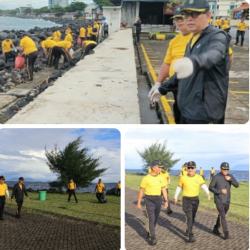 Sebanyak lebih dari 1.000 personel kepolisian dikerahkan untuk menyisir sampah di sepanjang Jalan Boulevard 1 hingga kawasan Megamas Manado.