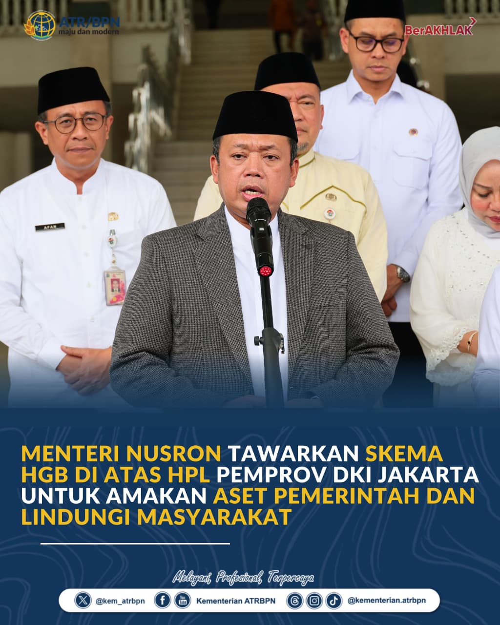 “PR selanjutnya adalah menyelesaikan tanah-tanah barang milik daerah (BMD) Provinsi DKI Jakarta yang sudah puluhan tahun diduduki masyarakat. Skemanya sudah ada, seperti di Cilincing. Nanti kita terbitkan HGB di atas HPL sehingga aset negaranya tidak hilang, tetapi masyarakat juga tidak perlu diusir,” ujar Menteri Nusron usai menyerahkan 3.922 sertipikat tanah aset Pemerintah Provinsi DKI Jakarta kepada Gubernur Pramono Anung, di Masjid Raya K.H. Hasyim Asy’ari, Jumat (13/02/2026).