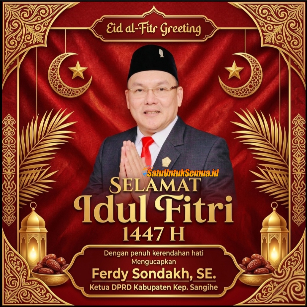 Sangihe, SatuUntukSemua.id – Ketua DPRD Kabupaten Kepulauan Sangihe, Ferdy Sondakh, memberikan ucapan selamat kepada masyarakat Muslim yang merayakan Hari Raya Idul Fitri 1447 Hijriah.