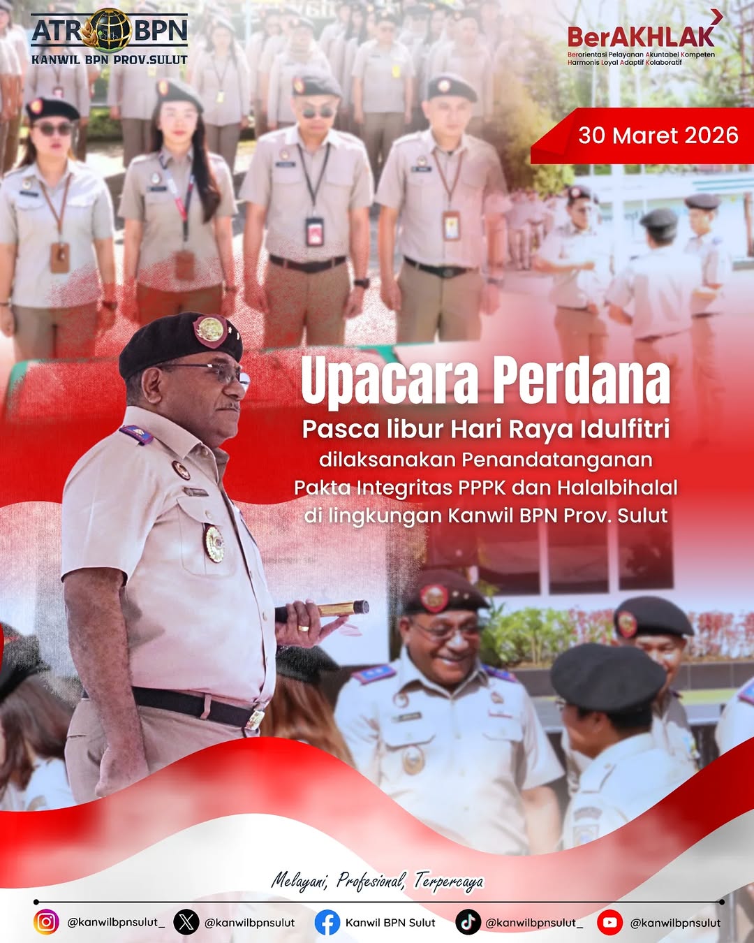 Manado, SatuUntukSemua.id – Kantor Wilayah (Kanwil) Badan Pertanahan Nasional (BPN) Provinsi Sulawesi Utara (Sulut) melaksanakan upacara perdana setelah libur Hari Raya Idul Fitri 1447 Hijriah, Senin (30/03/2026).