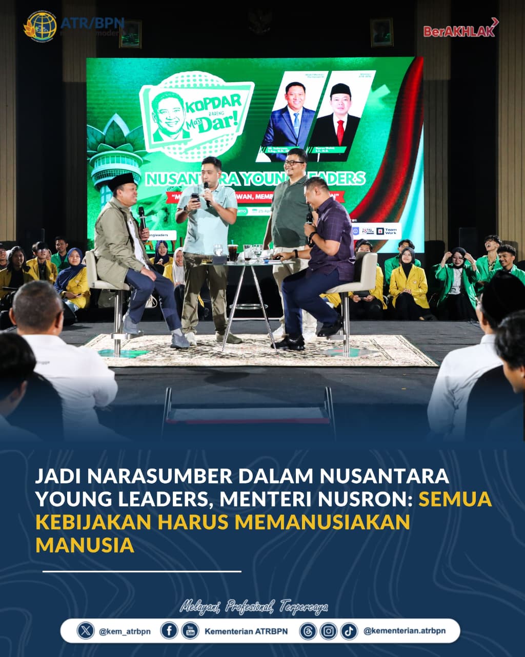 “Karena kita (mantan) aktivis mahasiswa, cara menyelesaikan masalah itu dengan cara pendekatan yang kemanusiaan dan berkeadilan. Manusia itu kita tempatkan yang utama. Semua kebijakan ini harus memanusiakan manusia,” ujar Menteri Nusron.
