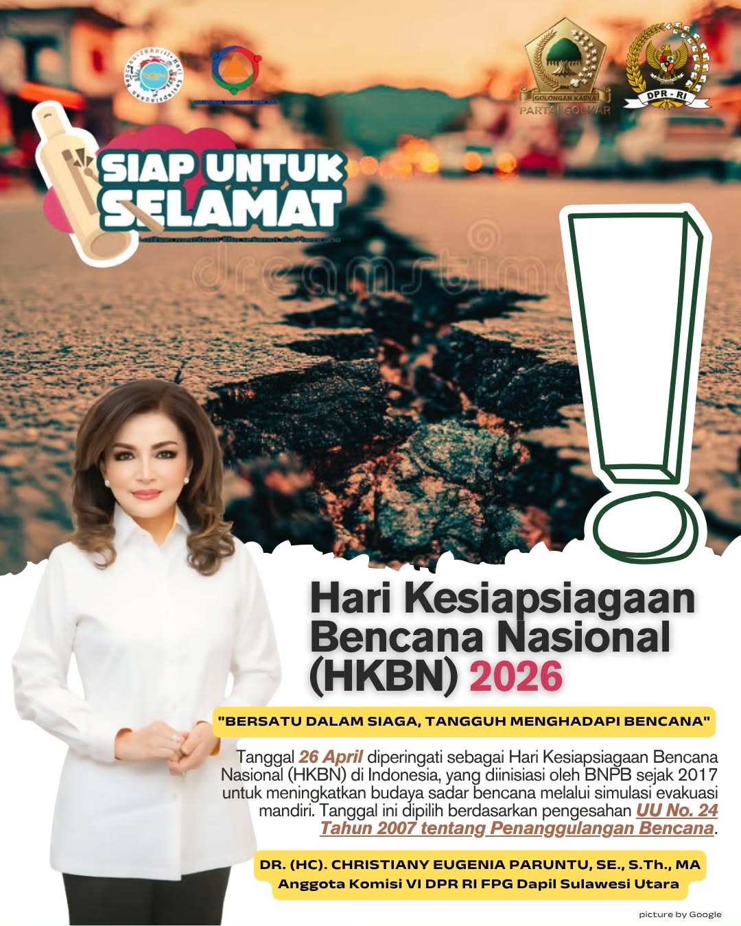 Manado, SatuUntukSemua.id — Memperingati Hari Kesiapsiagaan Bencana Nasional (HKBN) 2026 yang jatuh setiap 26 April, Anggota DPR RI Komisi VI Dapil Sulawesi Utara, Christiany Eugenia Paruntu (CEP), menyerukan penguatan budaya sadar bencana di seluruh lapisan masyarakat.